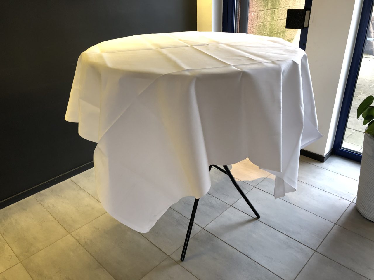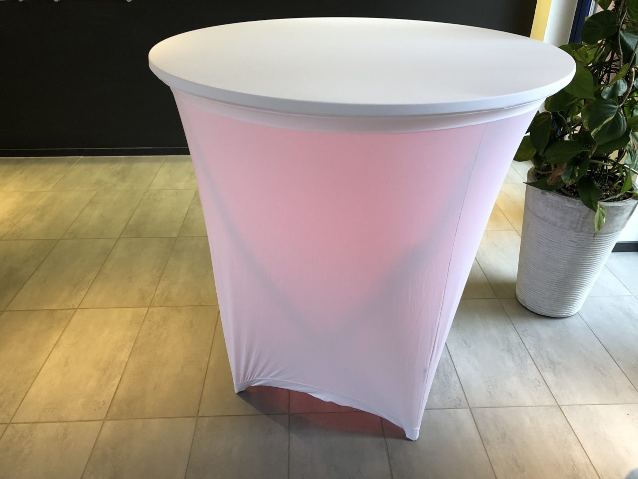 Ihopfällbart ståbord med vit laminatskiva och metallben, 110cm Ø skiva.