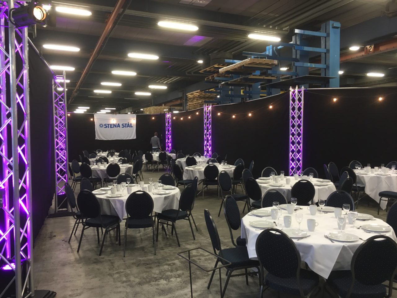 Trossvägg, kan användas för att ”klä in” lokal eller för att skärma av. Består av 3 meter höga tross med svart tyg emellan (5-6 meter mellan varje tross) samt belysning i varje tross. Går att få special byggt efter lokalens storlek och utseende. Priset anges per löpmeter!